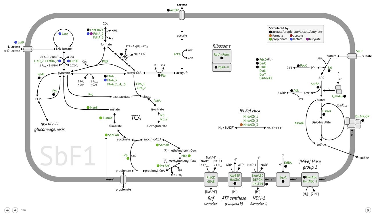 低丰度Desulfosporosinus的多功能能量代谢。Desulfosporosinus SP。MAG SbF1编码了用于异化硫酸盐还原的完整规范途径(图1和表 S1a )。这包括硫酸腺苷酰转移酶(Sat),腺苷酰基硫酸盐还原酶(AprBA),异化亚硫酸还原酶(DsrAB)和释放硫化物的DsrC,它们依次参与硫酸盐还原成硫化物。此外,检测到编码电子传递QmoAB和DsrMKJOP络合物的基因,与他们的亚基组成是典型的用于Desulfosporosinus物种(30,31,33,34)。其他dsr基因包括dsrD,dsrN和dsrT(38),具有迄今未失效的功能; fdxD,编码[4Fe4S] - 赋予毒素; 和第二组DsrMK家族编码基因(dsrM2和dsrK2)。SbF1还编码三聚异化亚硫酸还原酶AsrABC(厌氧亚硫酸还原酶)(39)。