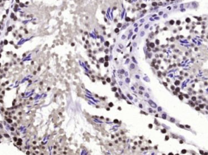 多聚甲醛固定,石蜡包埋(小鼠睾丸);经柠檬酸钠缓冲液(pH6.0)煮沸15min后获得抗原;用3%过氧化氢阻断内源性过氧化物酶20分钟;阻断缓冲液(正常山羊血清)37℃30min;用(BPTF)多克隆抗体进行抗体孵育在4°C下1:200整晚未结合的全身,然后根据SP试剂盒(兔子)说明和DAB染色进行操作。